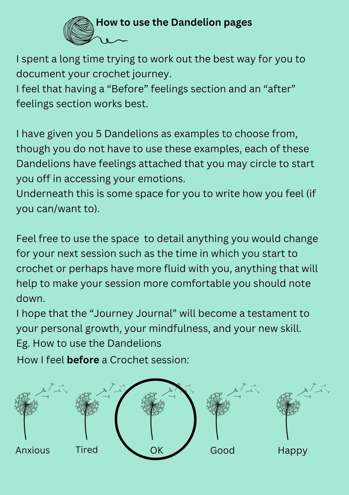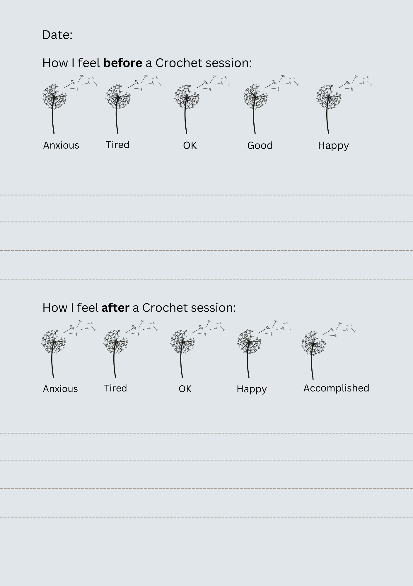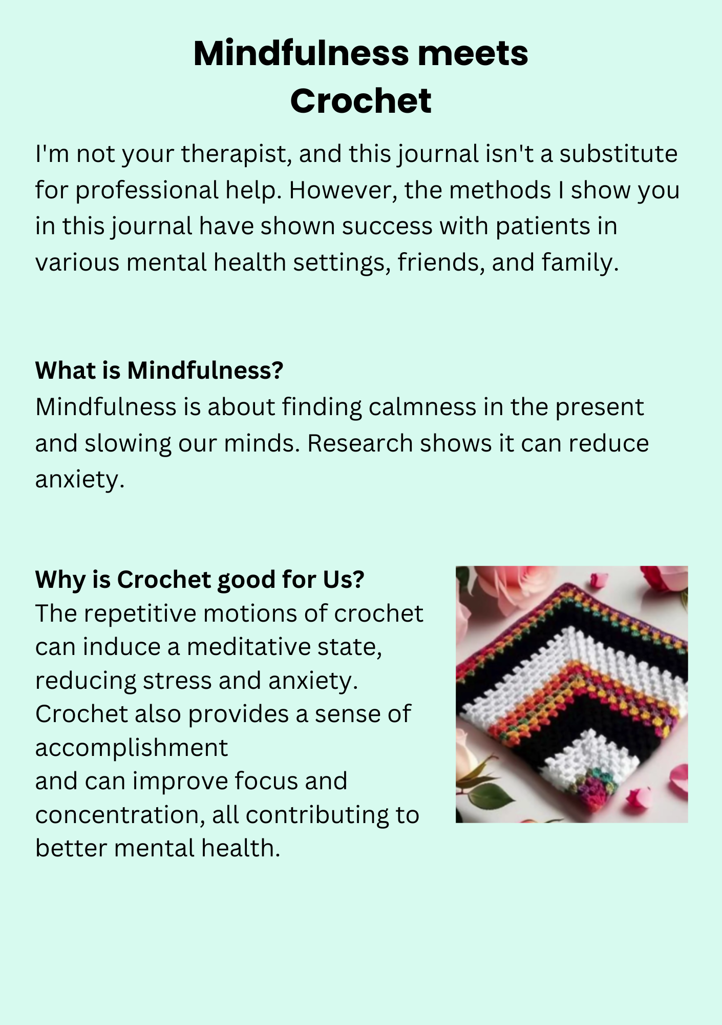Crochet and mindfulness naturally complement each other, the rhythmic repetitive motion of crocheting slows your mind, calms your body, and helps you be fully present. The Journey Journal is designed to capture your progress, reflect on emotions, and celebrate small achievements.